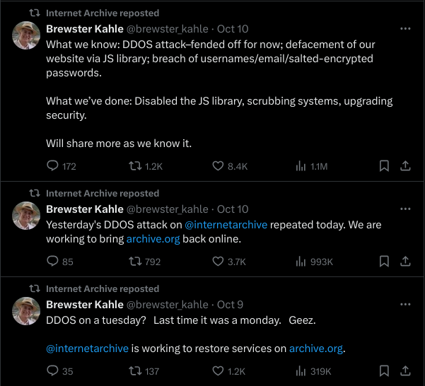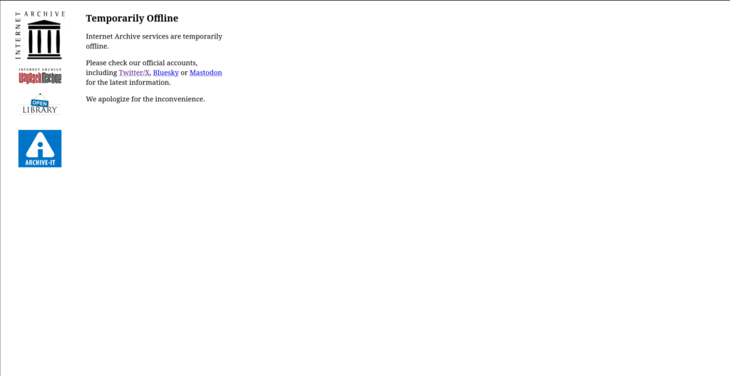 سایت archive.org آرشیوی از وبسایت های اینترنت رو داخل خودش نگهداری میکنه یا بهتره بگم میکرد. حدودا چند روز پیش خبر اومد که این سایت هک شده و الان صفحه اول سایت به شکل زیر هست :