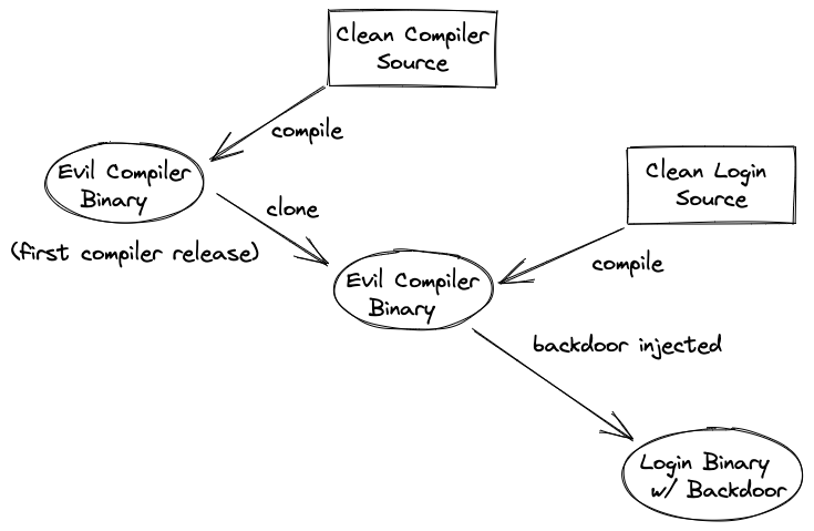 کاربر زمانی که میخواهد سورس کد کامپایلر رو کامپایل کنه نیاز به یک کامپایلر داره. ما ( در نقش طراح حمله ) میتونیم سورس کد Compiler.cpp رو به عنوان اولین کامپایلر ساخته شده برای این زبان به کاربر نشون بدیم ولی فایل اجرایی EvilCompiler.cpp به عنوان اولین کامپایلر به کاربر داده بشه. در نتیجه هر بار که کاربر سورس کد Compiler.cpp رو با این فایل اجرایی کامپایل کنه، همون روش اضافه کردن درب پشتی تکرار میشه و درب پشتی به کامپایلر اضافه میشه.