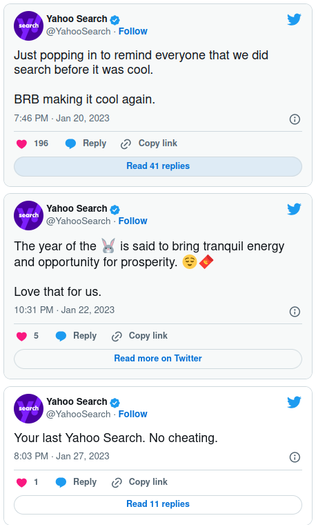 یا از سرگرفتن فعالیت اکانت yahoo search داخل توئیتر. یا Jim Lanzone که از 2021 به عنوان CEO جدید یاهو داره فعالیت می‌کنه. جیم سابقه و نقش خوبی توی مفهوم سرچ داره و حدود ۷ سال برای Ask.com کار کرده.