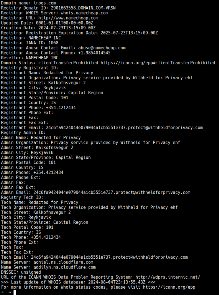 برای اینکه ببینم چه کسی این دامنه رو ثبت کرده توی ترمینالم از این url یک whois گرفتم و خروجی به شکل زیر بود :